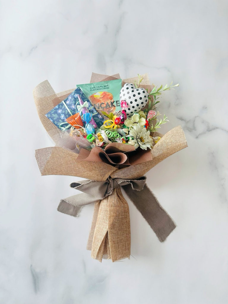 キャンディやチョコレート、クッキーなどが華やかに飾られていて、まるで本物の花束のような美しさ。